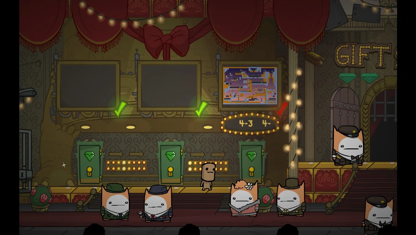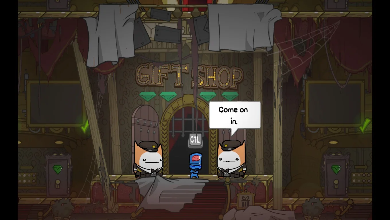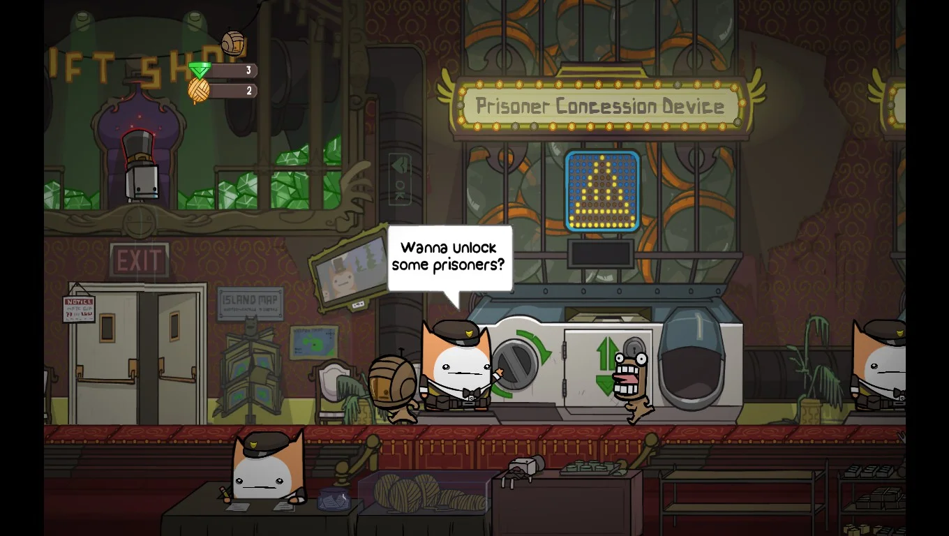 "The Gift Shop?", you might ask. Why yes, there is a gift shop in this prison/theater. Besides buying weapons from shady guards, you can also buy prisoners. The gems you're required to collect in each level are used to unlock new prisoner heads, again, at random.