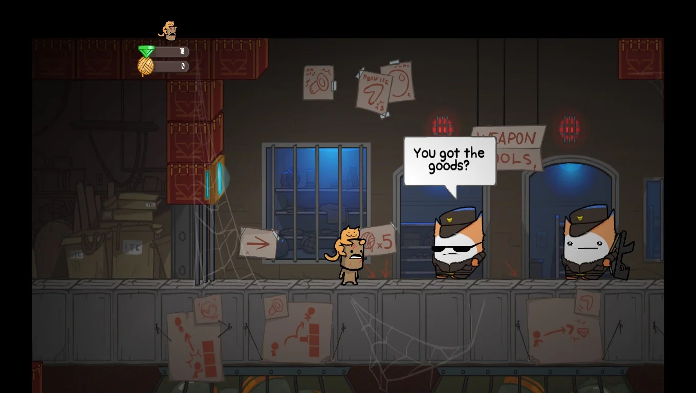 Speaking of which, the way you unlock the weapons is even amusing. Each level has a ball of golden yarn, by collecting them you can head to the Gift Shop and find the to bribe-able guards, who will give you a random weapon for 5 yarn. The last one I unlocked was a boomerang, which compared to the fireball and eletro-hoduken it's utterly useless.