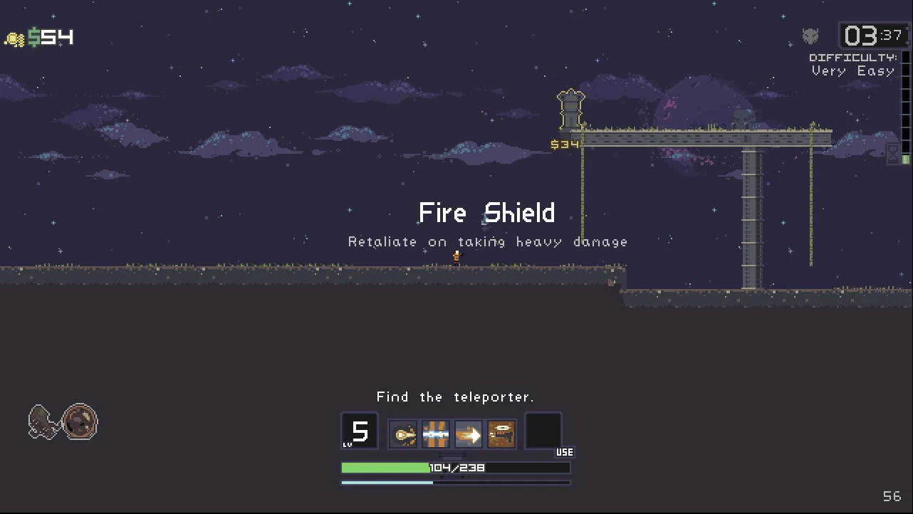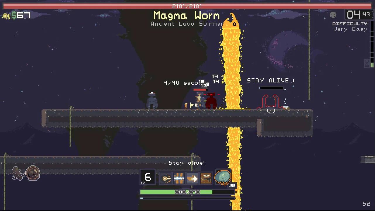 The most interesting thing about Risk of Rain isn't the art or the combat or enemies, it's the way the game plays. I tried capturing video but my laptop just isn't up to snuff (read: utter shit) and the game dropped from around 60 fps to about 3, so I'll subside on screenshots. See the bar and timer with the difficulty on the top right of the screenshot? That bar slowly fills as time goes on, raising the difficulty. The fun part is deciding how long you want to stay in a level farming for experience and money to buy items from chests and other various things around the map. The longer you stay the more you can get, but the great chance you have of getting horribly murdered.