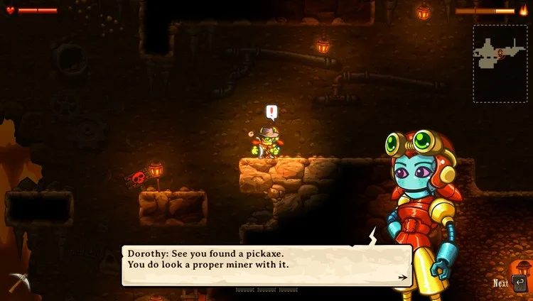 You start the game off falling through a hole in the ground on your way to the mining claim your uncle has given you. You meet a girl-bot named Dorothy down in the mine who informs you that your uncle is dead...right over there. Hey, why don't you go take the pickaxe from his corpse and start up the mining operation again? That sound good? Good.