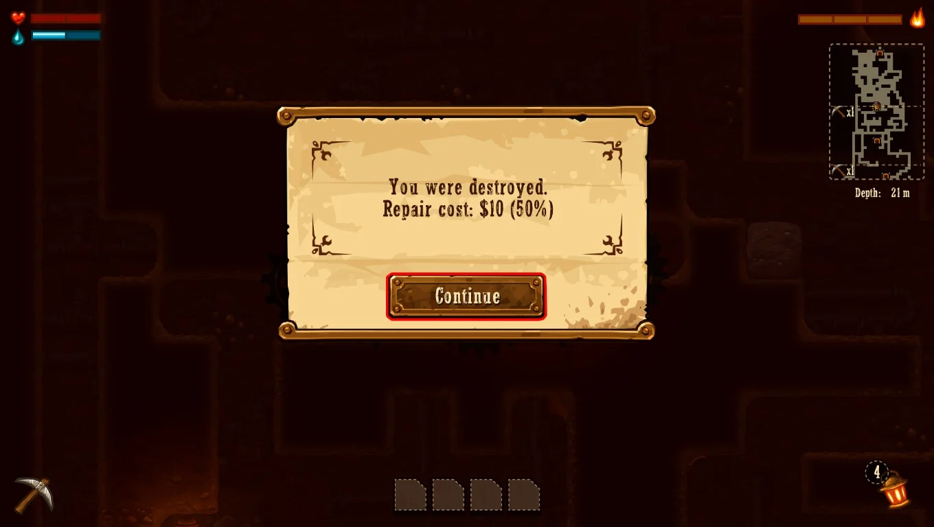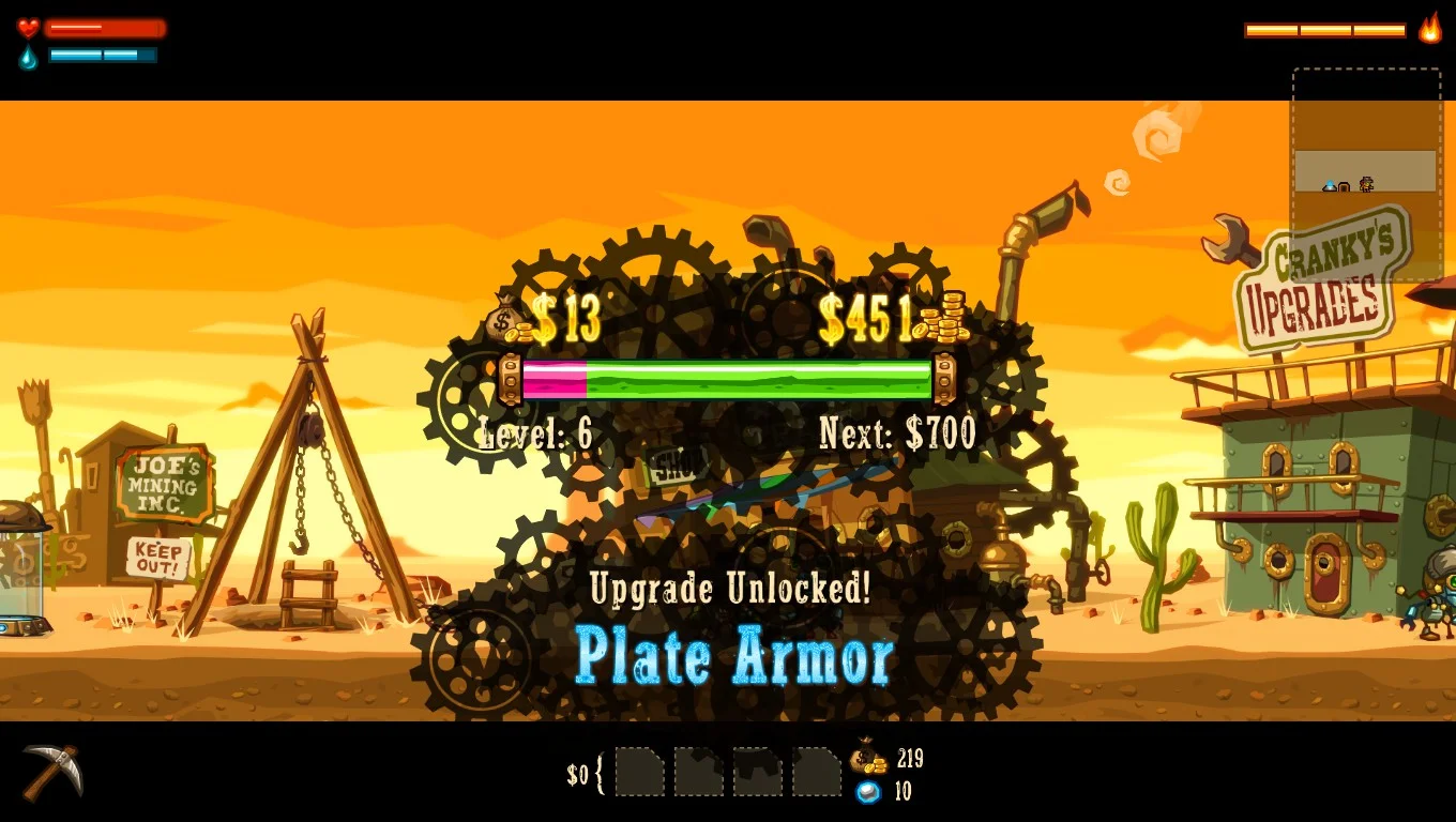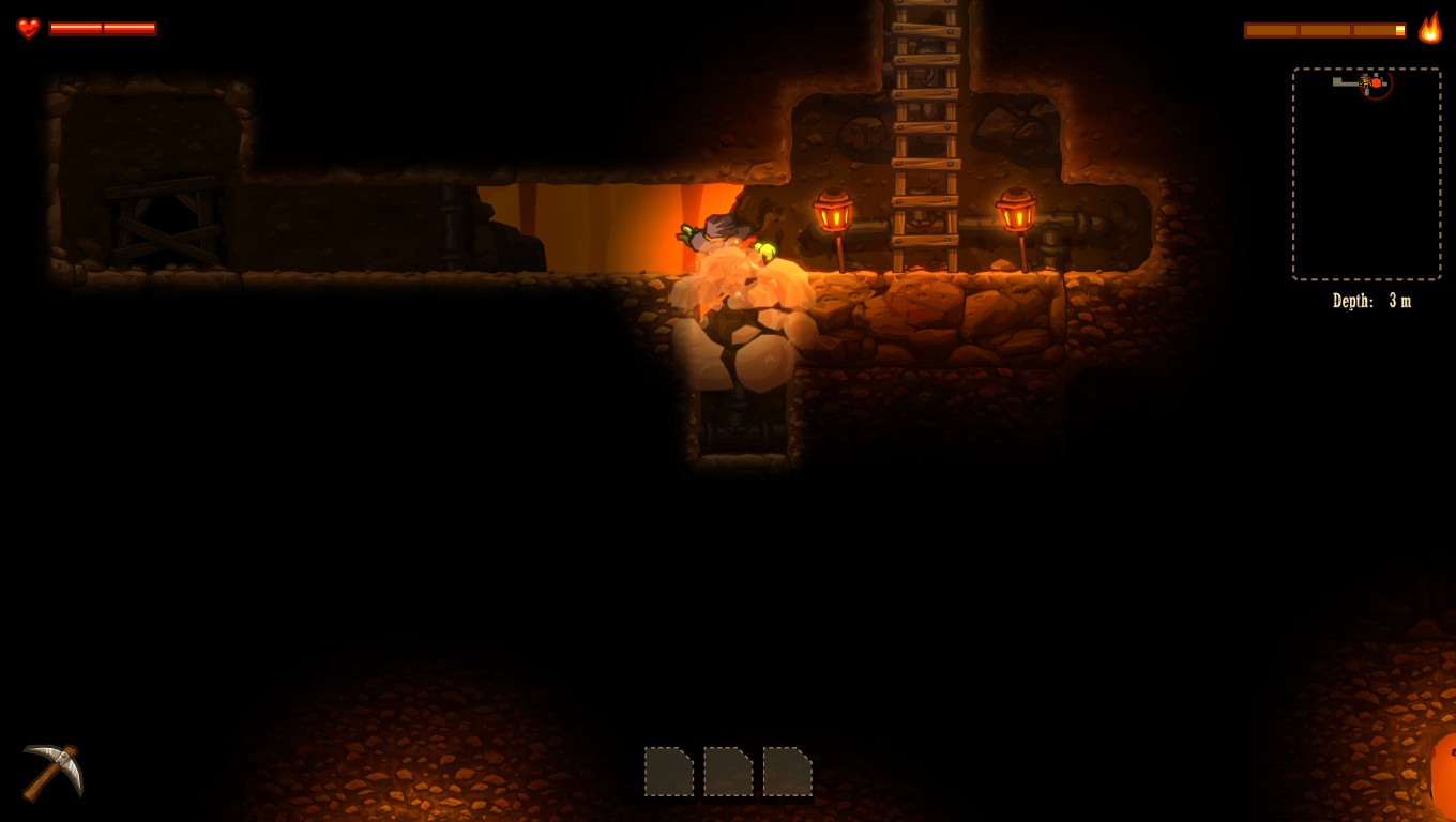 The game starts off quite basic. Head down, dig up ore and gems, head back up, sell it, head back down. Slowly you'll build up money (and thus levels) and buy upgrades like a larger backpack, armor, picks, lanterns and the like.