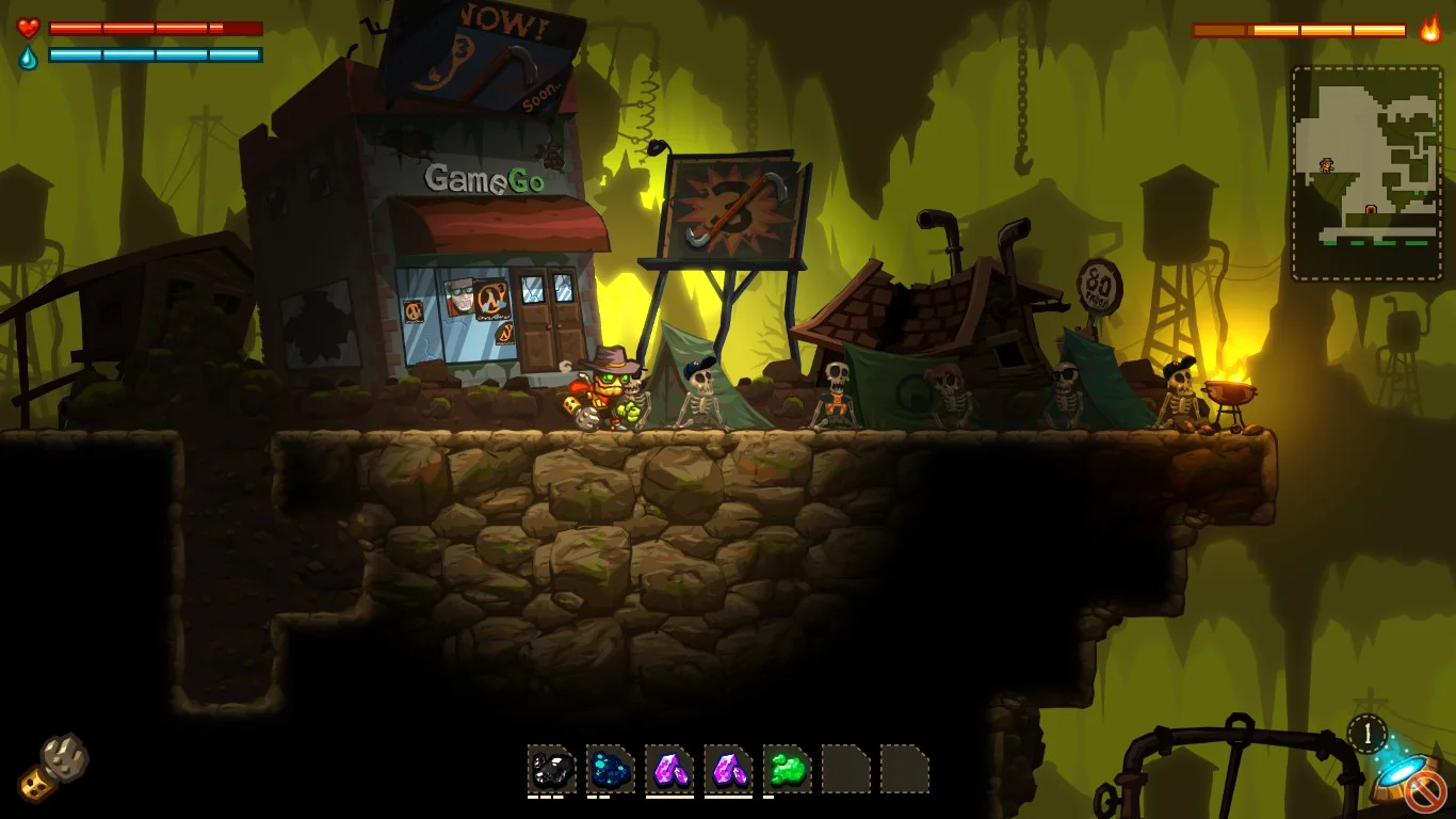 Well, the game is gorgeous. The art style fits the world perfectly, the animations are pretty and for a barren wasteland it's brightly coloured and vibrant. Breaking through dirt, rocks and ore are all satisfying. The backgrounds give the world depth and add to the creepiness as you go deeper. The music is quite fitting, going from old western to creepy the deeper you get. The sounds of enemies and traps are loud and distinct so you know what's coming.